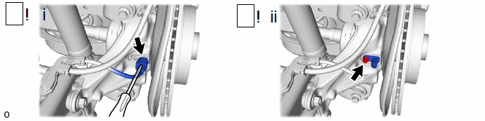 (1) A l'aide d'un tournevis dont la pointe a été préalablement entourée de ruban adhésif de protection, débrancher le connecteur d’ensemble de câble de frein de stationnement n° 2 du capteur de contrôle de dérapage arrière.