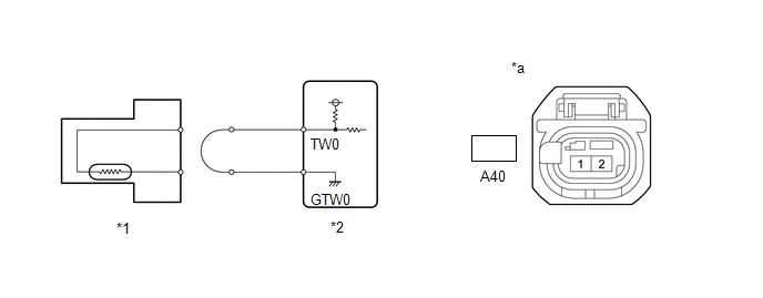 (b) Brancher les bornes 1 (GTW0) et 2 (TW0) du connecteur de capteur de température du liquide de refroidissement de la batterie côté faisceau de câbles.