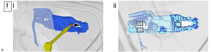 (2) Libérer les guides pour déposer le sous-ensemble d'armature de poignée extérieure de porte arrière, comme indiqué sur le schéma.