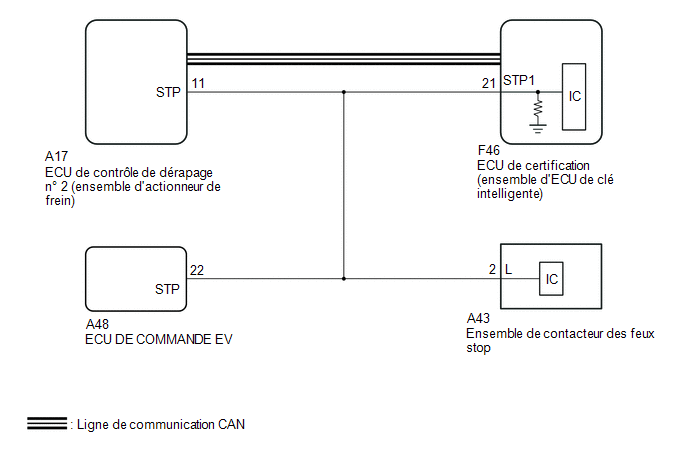 Ce DTC est enregistré lorsque le signal de frein envoyé via la ligne directe et le signal de frein envoyé via la communication CAN ne correspondent pas.