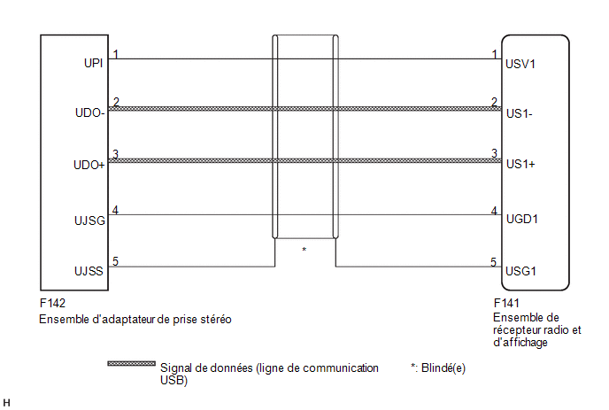 (a) Débrancher le connecteur F142 de l'ensemble d'adaptateur de prise stéréo.