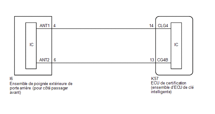 Si la fonction de verrouillage à l'ouverture ne fonctionne pas pour la porte avant droite uniquement, alors que la fonction de déverrouillage à l'ouverture fonctionne, le code de demande est transmis correctement pour la porte arrière droite. Dans ce cas, il peut y avoir un dysfonctionnement associé au capteur de verrouillage (branchement entre l'ECU de certification [ensemble d'ECU de clé intelligente] et l'ensemble de poignée extérieure de porte arrière (pour côté passager avant).
