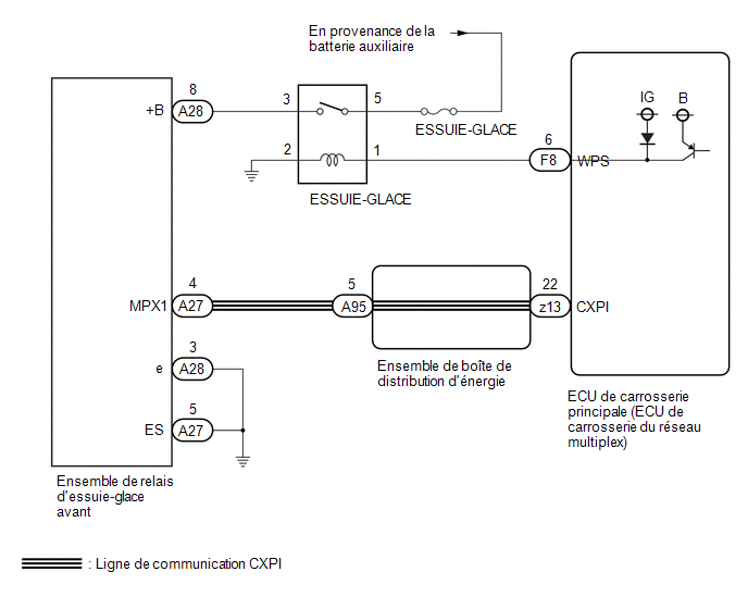L'ECU de carrosserie principale (ECU de carrosserie de réseau multiplex) et l'ensemble de relais d'essuie-glace avant communiquent via la communication CXPI. L'ECU de carrosserie principale (ECU de carrosserie de réseau multiplex) enregistre ce DTC si la communication est anormale.