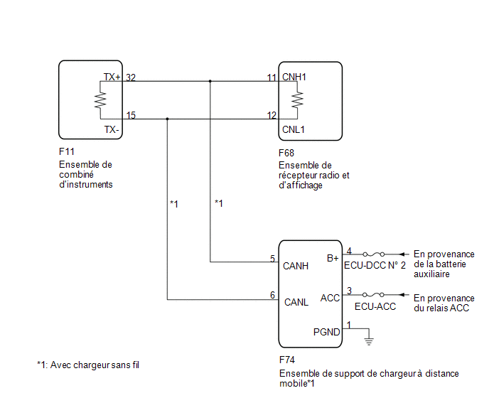 Ces DTC sont enregistrés lorsque l'ensemble d'autoradio et d'affichage détecte un dysfonctionnement au niveau de la communication avec l'ensemble de combiné d'instruments et l'ensemble de socle de chargeur mobile à distance.*1