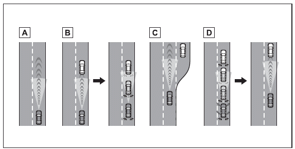 ■ Véhicules en avant du vôtre susceptibles de ne pas être détectés correctement par le capteur