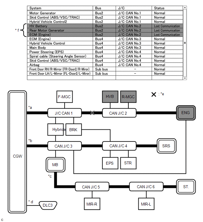 Les ECU ou les capteurs plus éloignés de l'ECU de contrôle de bus secondaire (ECU équipée de la fonction de portail d'accès) que la coupure de circuit dans les câbles s'affichent comme ne communiquant pas sur l'écran "Communication Bus Check". |