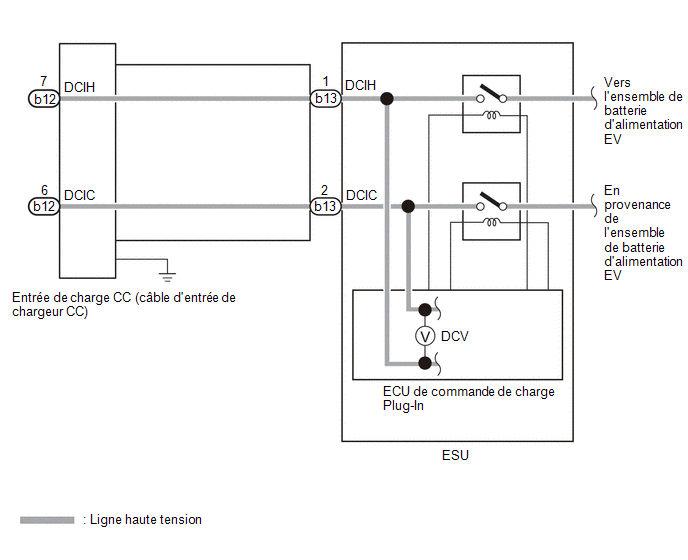 L'ECU de commande de charge plug-in utilise le capteur de tension DC (capteur de tension d'entrée de charge rapide DC) pour contrôler la tension entre les relais DC DCRB (côté +) et DCRG (côté -).