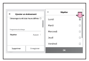 Lorsque l'option est active, le programme de recharge est répété ce jour-là. Il est possible d'activer plus d'un seul jour.